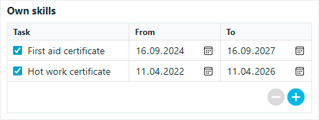 You can use skills management, for example, to manage first aid training, hot work permits, and other qualifications, as well as to monitor their validity periods.