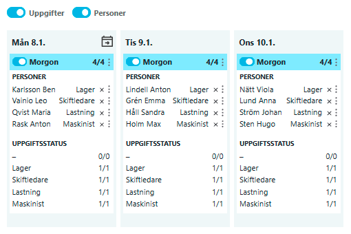 Ifall du filtrerar bort personerna ser du statusen på varje uppgift i skiften.