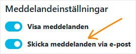 Du aktiverar e-postmeddelanden genom att välja ”Skicka meddelanden via e-post” i inställningarna.