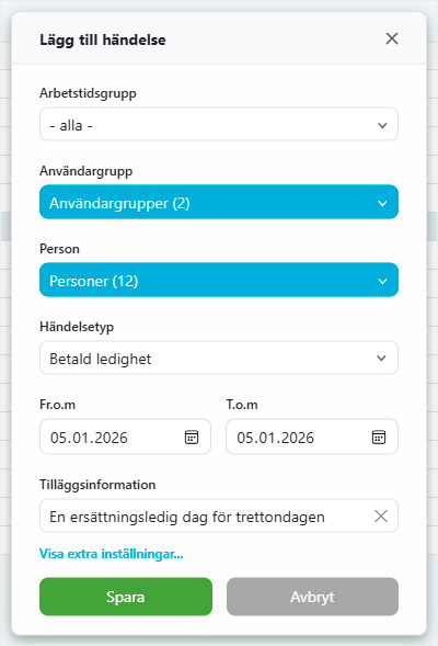 Funktionen är särskilt praktisk för registrering av förskjutna helgdagar och andra gemensamma frånvaro.