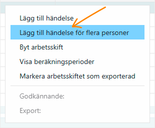 Nu kan du lägga till arbets- och arbetsfashändelser för flera personer samtidigt. Funktionen finns i snabbmenyn (högerklick) vid enskilda arbetsskift, händelser eller personer.
