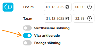 Därför har en ny valmöjlighet lagts till i sökningen för arbetstidsuppföljningsrapporter, projektuppföljningsrapporter och händelserapporter: Visa arkiverade. När detta val är aktiverat visas alla personer som du har behörighet att se i rapporterna.