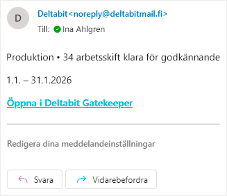 E-postmeddelandet visar samma information som det interna meddelandet i programmet. Via länken i meddelandet kommer du direkt till rätt vy så att du kan agera snabbt även utan att vara inloggad.