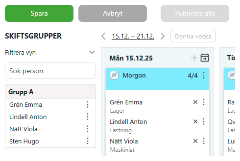 Godkänn utförda timmar i två steg och få meddelanden om det. Lägg till skift direkt i arbetsskiftsplaneringsvyn.
