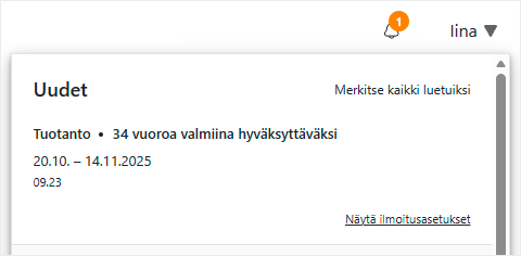 Ilmoitusta klikkaamalla pääset suoraan tarkastelemaan ja hyväksymään vuoroja. Tämä helpottaa erityisesti suurten yritysten arkea, joissa ilmoituksia voi tulla paljon.