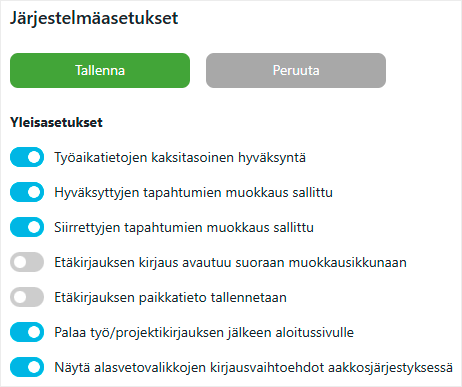 Työajanseuranta tukee nyt kaksivaiheista hyväksyntää: ensin tapahtumat tarkistetaan, sitten hyväksytään. Ominaisuus voidaan ottaa käyttöön yrityskohtaisesti järjestelmäasetuksista.