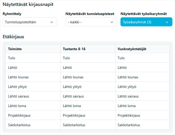 Selaimen asetuksista voit nyt tarkastella, mitä kirjausnappeja näkyy eri tunnistuspisteissä ja työaikaryhmissä.
