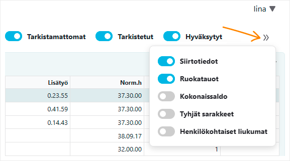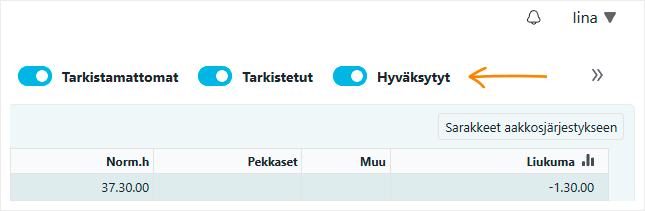 Työaikatietojen suodatukseen on tullut uusia vaihtoehtoja. Voit nyt suodattaa työaikatietoja hyväksyntätilan perusteella: tarkistamattomat, tarkistetut ja hyväksytyt.