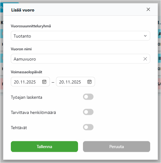 Voit myös määrittää vuoroille voimassaolojakson, jolloin esimerkiksi sesonkivuorot näkyvät vain määriteltynä aikana.